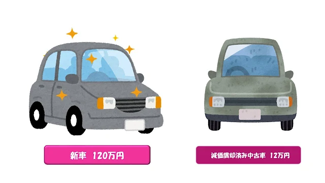 例えば車。新車で120万円で買った車は、会社の仕事で走り回って、会社の利益を増やしながら、古くなって資産としての価値を減らしていきます。120万円で購入した車を、5年後に120万円で売ろうと思っても売れません。