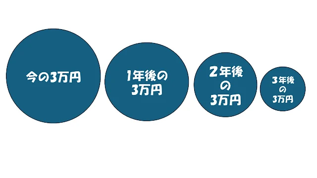 となり、1年後の3万円は、現在の価値だと27,272円にしかならないのです。